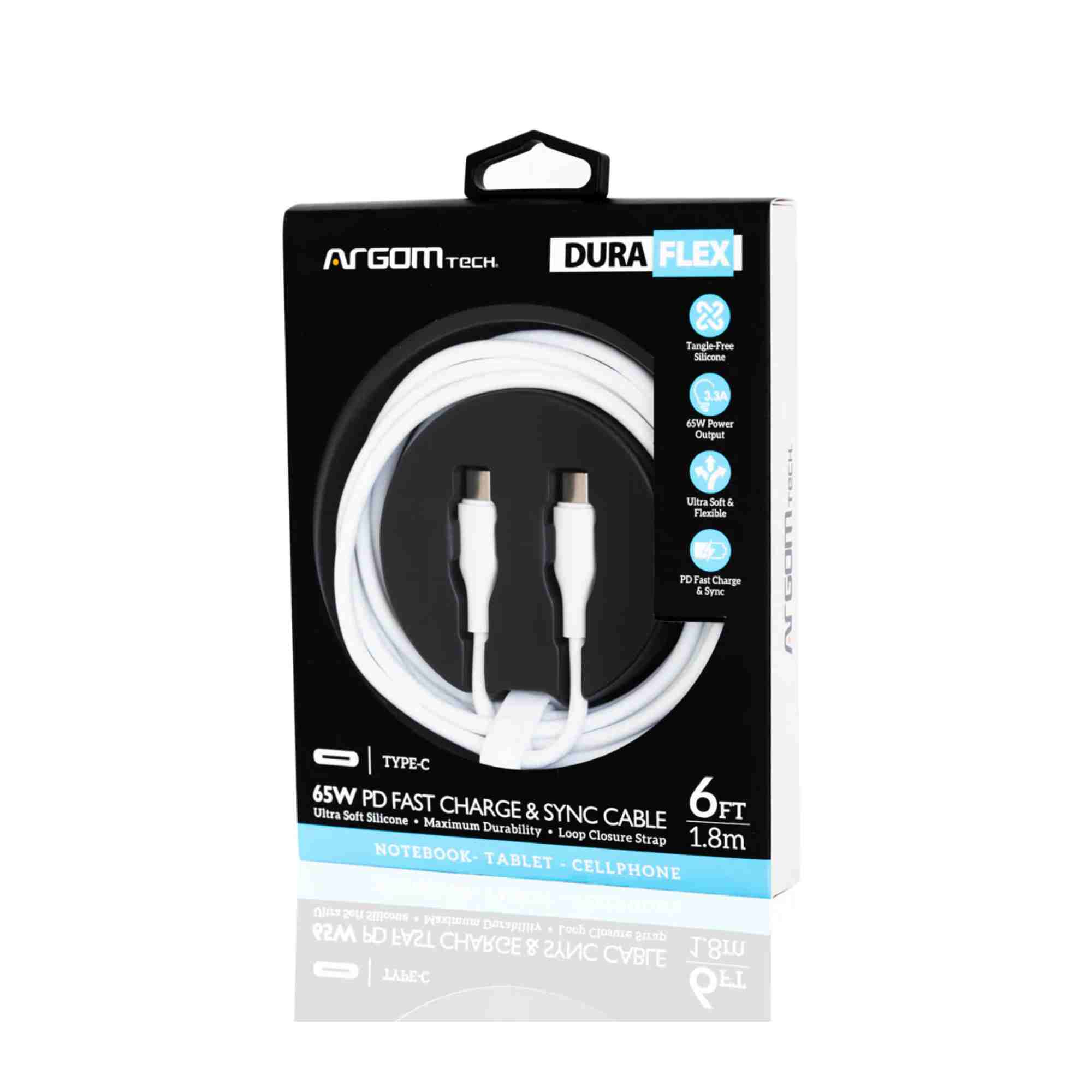 CABLE ARGOM ARG-CB-0070WT DURA FLEX 65W PD FAST CHRG TYPE C TO TIPE-C SILICONE 1.8M 6FT WHITE
