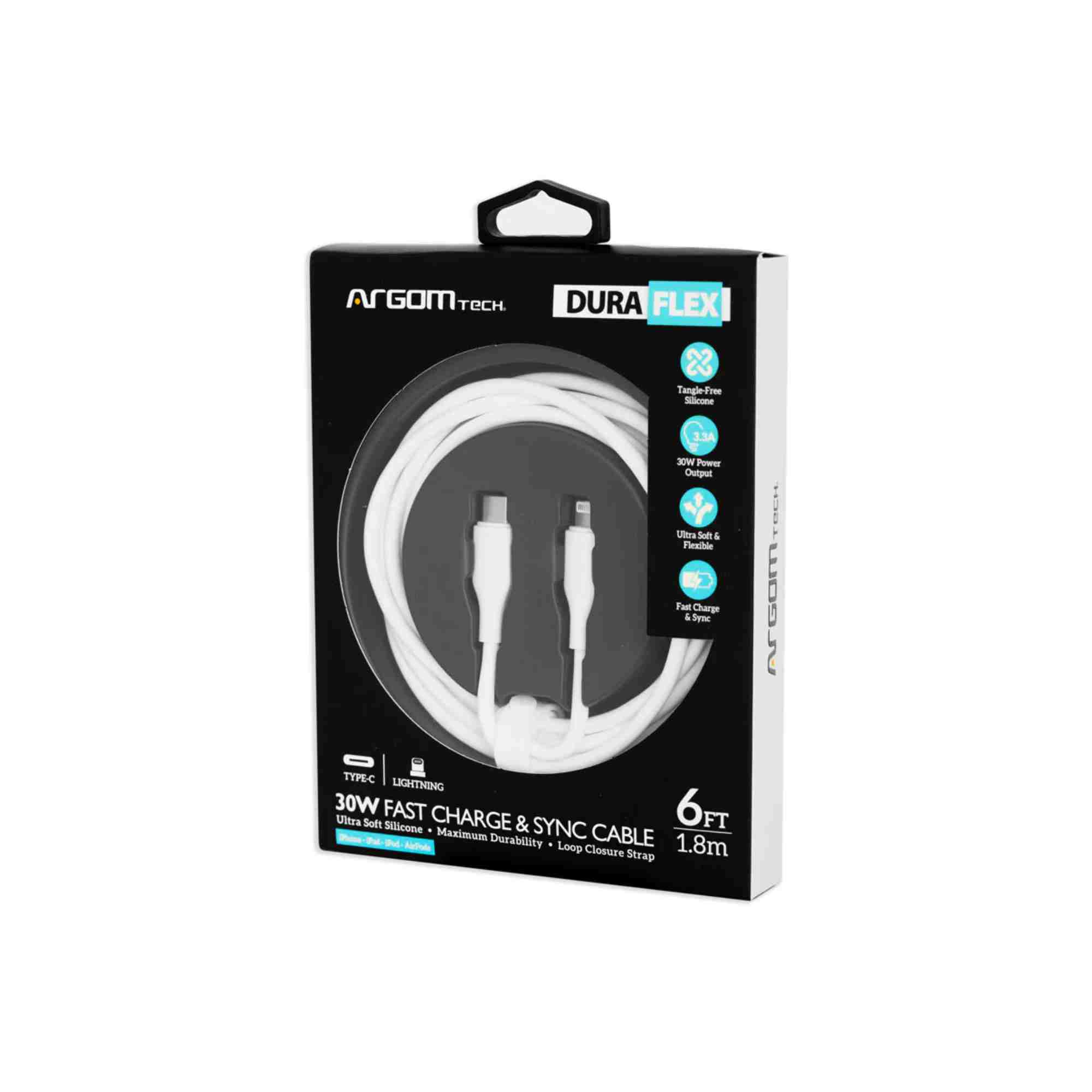 CABLE ARGOM ARG-CB-0072WT DURA FLEX 30W FAST CHRG TYPE C TO LIGHTNING SILICONE 1.8M 6FT WHITE