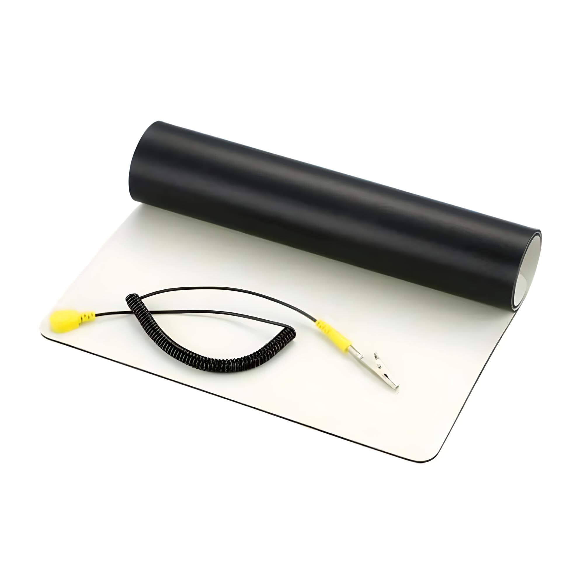 Mantel profesional resistente a los ácidos, a los álcalis y al desgaste para la reparación de equipos sensibles a la estática. El caucho sintético del que está hecha la alfombra tiene conductividad a granel y asegura que la descarga electrostática y el voltaje eléctrico se drenen hacia el objeto de tierra. Hay un conector al que se conecta un cable trenzado con una pinza de cocodrilo. También en el conector hay una ranura adicional para un brazalete ESD