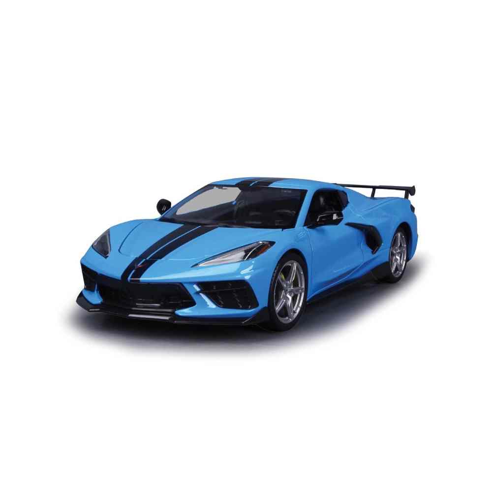 - Nuevo modelo de automóvil fundido a escala 1/18 del Chevrolet Corvette Stingray C8 Coupe 2020 con ala alta azul con rayas negras, modelo de automóvil fundido a presión de Maisto.