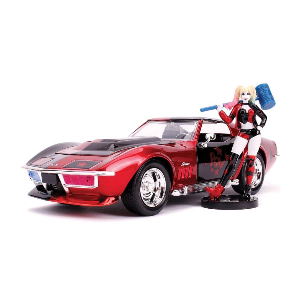 ¡Una de las villanas más queridas de DC Comics! ¡Ya puedes encontrar a Harley Quinn recorriendo Gotham City en su impresionante Stingray personalizada de 1969! Esta figura de metal fundido a presión te dejará boquiabierto con su fantástica y compleja pintura en rojo manzana de caramelo y negro. Sus brillantes cargadores cromados, los tubos laterales y una enorme entrada de aire en el capó ayudan a esta bomba a moverse por Gotham rápidamente. ¡La figura de Harley Quinn en metal fundido está pintada a mano con maestría y posa con su enorme mazo en la mano!
