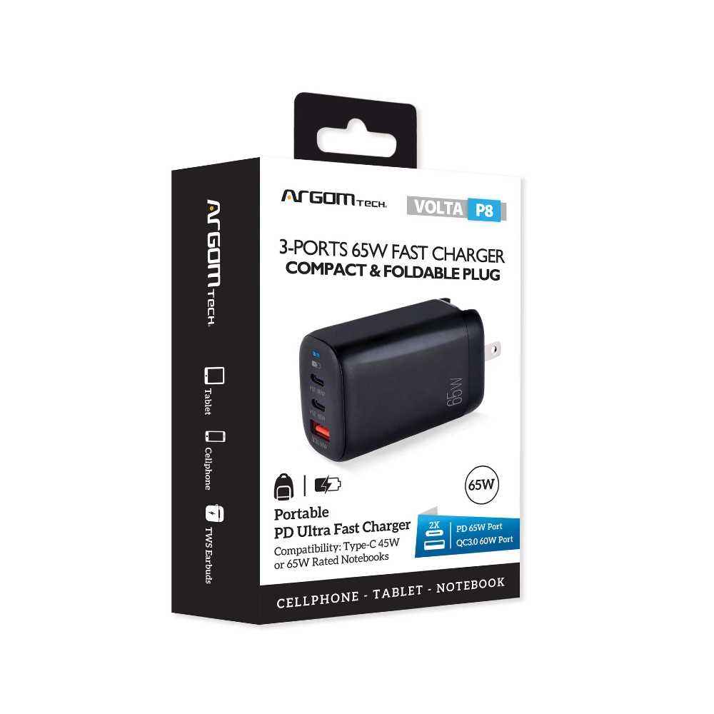 CARGADOR ARGOM ARG-AC-0126BK 3-PORTS PD FAST WALL VOLTA P8 2*TYPE-C+USB 65W