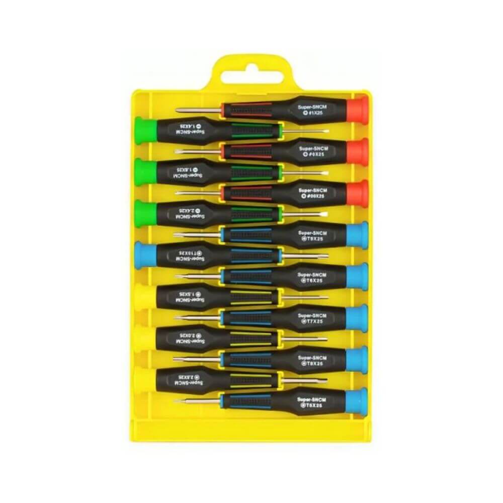 - El juego de destornilladores de precisión cuenta con mango moldeado con precisión y tapas giratorias.