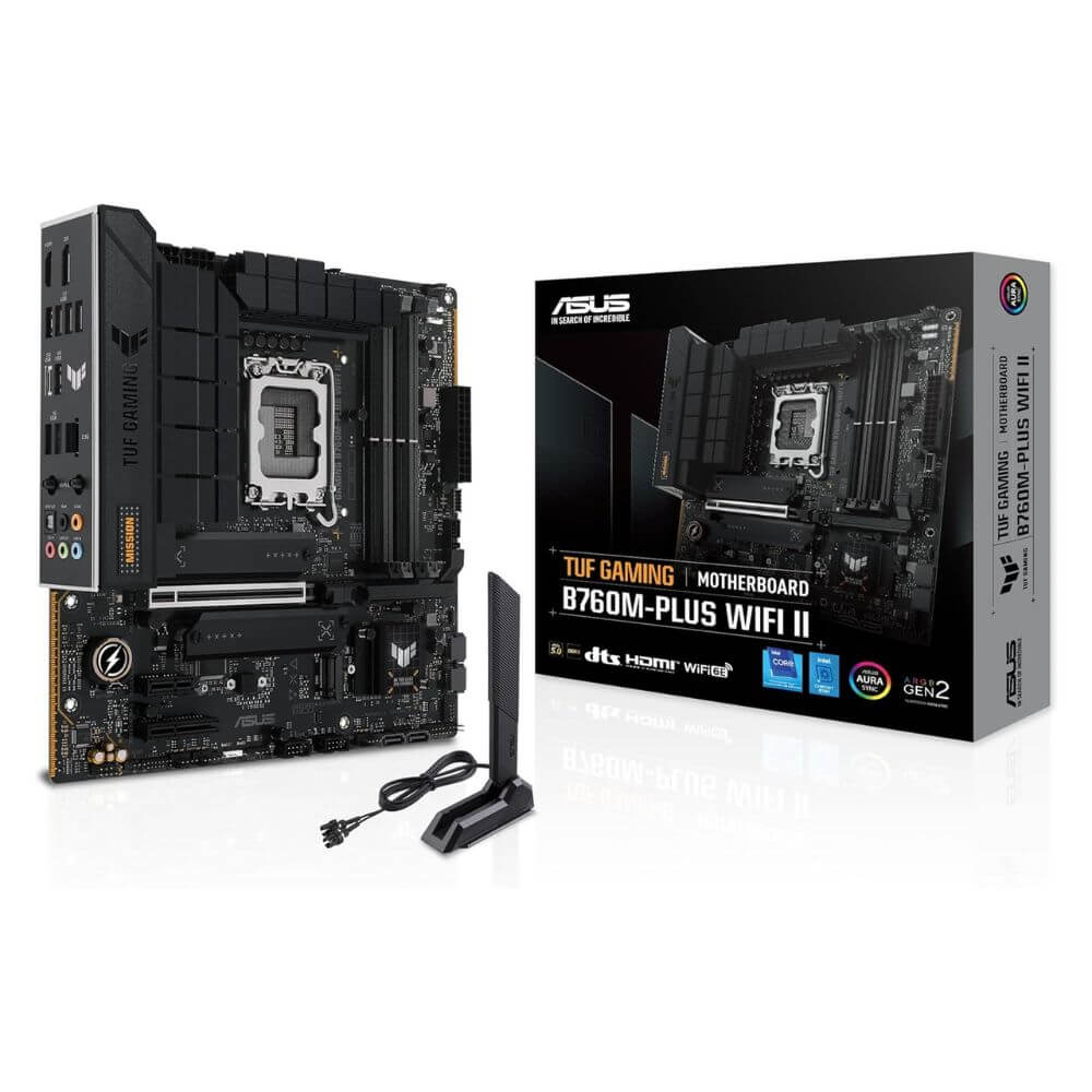 TUF GAMING B760M-PLUS WIFI II toma todos los elementos esenciales de los últimos procesadores Intel® y los combina con características listas para el juego y durabilidad comprobada. Diseñada con componentes de grado militar, una solución de energía mejorada y un sistema de enfriamiento integral, esta placa base supera las expectativas con un rendimiento sólido como una roca para juegos de maratón. Las placas base TUF GAMING también se someten a rigurosas pruebas de resistencia para garantizar que puedan soportar condiciones en las que otras pueden fallar. Estéticamente, este modelo incorpora una placa de identificación en relieve y elementos de diseño geométrico para reflejar la confiabilidad y estabilidad que definen a la serie TUF GAMING.