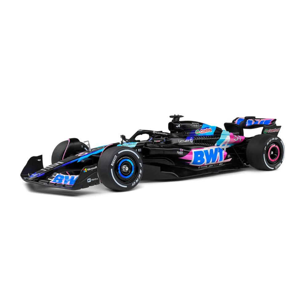 Coche de fundición a escala 1:18. Alpine F1 Team A524 E. Ocon Miami GP 2024, azul y negro con decoración BWT.